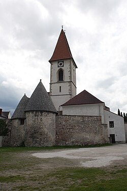 Der Karner aus dem Ende des 12. Jahrhunderts steht nördlich des Altchores im Verbund mit der wehrhaften Ummauerung des ehemaligen Friedhofes, er ist zweigeschoßig, hat einen kreisrunden Grundriss mit einer überhalbkreisförmigen Apsis im Osten, beide unter gemauerten leicht bombierten verschieden hohen Kegeldächern, mit Steinkugeln bekrönt.