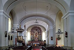 An das rechteckige dreijochige Langhausinnere mit einem schmalen Emporenjoch schließt ein leicht eingezogener Chor mit geradem Schluss an. Die Wände sind mit eingezogenen Doppelwandpfeilern gegliedert, darüber schließen korbbogenartige Doppengurtbögen mit Platzlgewölben an, welche moderne barockisierende Stuckkartuschen tragen. Im nördlichen Langhausbereich öffnet sich das Langhaus östlich zum spitztonnengewölbten romanischen Turmquadrat und flankiert zu den gotischen Seitenschiffen und heutigen Seitenkapellen unter Netzrippengewölben aus der zweiten Hälfte des 15. Jahrhunderts. Nach dem Turmquadrat zeigt sich ein hoch proportionierter einjocher Chor mit einem Fünfachtelschluss aus der zweiten Hälfte des 14. Jahrhunderts. Die Anläufe des Kreuzrippengewölbe tragen barocke Stuckreliefs geflügelter Engelköpfe aus dem vierten Viertel des 17. Jahrhunderts. In der Nordwand ist ein Schulterportal zur alten Sakristei und eine rundbogige Sakramentsnische mit einem Blendmaßwerkrelief darübern und mit einem reichen Schmiedeeisengitter aus der zweiten Hälfte des 15. Jahrhunderts.