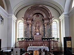 Der Hochaltar des Neubaues aus 1844 auf einem hohen Sockel hat einen klassizistischen Säulenaufbau triumphbogenartig überwölbt mit der übertragenen Statue Maria im Strahlenkranz auf einem barocken Sockel aus dem zweiten Viertel des 18. Jahrhunderts und einer Fassung aus der Mitte des 19. Jahrhunderts.