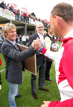 | Walter Hörmann als Sportdirektor des StFV nach dem steirischen 1. Klasse Mitte A-Spiel Grazer AK gegen FC Stattegg II am 31. 5. 2014 im Sportzentrum Graz-Weinzödl beglückwünscht seinen Kollegen beim GAK, Heinz Karner, zum Meistertitel | Eigenes Werk | BikeMike | Datei:20140531-GAK-Stattegg-II-walter-hörmann-heinz-karner-grazer-ak.jpg | |