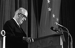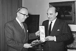 Walter Peter Hallstein (* 17. November 1901 in Mainz; † 29. März 1982 in Stuttgart) war ein deutscher Jurist, Hochschullehrer und Politiker (CDU).[1] Er war von 1951 bis 1958 Staatssekretär im Auswärtigen Amt und anschließend bis 1967 der erste Vorsitzende der Kommission der Europäischen Wirtschaftsgemeinschaft, einem Vorgänger der EU.[2][3] Sein Name ist mit der Hallstein-Doktrin verbunden, welche Beziehungen mit der DDR als unfreundlichen Akt gegen die BRD bestimmte.