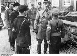 | Es folgt die historische Originalbeschreibung , die das Bundesarchiv aus dokumentarischen Gründen übernommen hat. Diese kann allerdings fehlerhaft, tendenziös, überholt oder politisch extrem sein. Deutschland, Model bei Hitlerjugend ADN-ZBII.Weltkrieg 1939-45Faschistisches Deutschland:Der faschistische Generalfeldmarschall Model, Oberbefehlshaber einer Wehrmachtsheeresgruppe, spricht einem HJ-Führer seine Anerkennung für die von der faschistischen Hitlerjugend durchgeführte Schanzarbeit aus. Abgebildete Personen: Model, Walter : Generalfeldmarschall, Ritterkreuz (RK), Heer, Deutschland ( GND 118582909 ) | Dieses Bild wurde im Rahmen einer Kooperation zwischen dem deutschen Bundesarchiv und Wikimedia Deutschland aus dem deutschen Bundesarchiv für Wikimedia Commons zur Verfügung gestellt. Das deutsche Bundesarchiv gewährleistet eine authentische Bildüberlieferung nur durch die Originale (Negative und/oder Positive), bzw. die Digitalisate der Originale im Rahmen des Digitalen Bildarchivs . | Jäger | Datei:Bundesarchiv Bild 183-J28036, Deutschland, Model bei Hitlerjugend.jpg | |