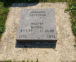 Am 21. April 1945 erschoss sich Walter Model im Spee’schen Wald,[31] zwischen Wedau und Lintorf unweit der Sechs-Seen-Platte, denn für ihn war schon der Gedanke einer Kapitulation als verantwortlicher Feldmarschall gegenüber Bernard Montgomery oder den Amerikanern unvorstellbar.[32] Seine verbliebenen Generalstabsoffiziere, Oberst Theodor Pilling, Oberstleutnant Roger Michael und Major Winrich Behr, begruben ihn, seinem Wunsch entsprechend, an Ort und Stelle.[33] Den unterstellten Kommandeuren im Ruhrkessel hinterließ er die nationalsozialistisch geprägte Botschaft: „Unter dem Druck der Kriegsereignisse zeigt sich, dass noch immer weite Kreise des deutschen Volkes und damit auch der Truppe vom jüdischen und demokratischen Gift der materialistischen Denkweise verseucht sind“.[34] Das Vorbild des Offiziers sei entscheidend, um den Sieg der nationalsozialistischen Idee zu erzwingen. Am 26. Juli 1955 wurde Models Feldgrab mit Hilfe von Winrich Behr und im Beisein seines Sohnes Hansgeorg Model wiedergefunden und die Leiche exhumiert. Auf der Kriegsgräberstätte Vossenack in der Nordeifel fand er seine letzte Ruhe. Sein Grab dort trägt die Nummer 1074. Die Grabplatte von Models Grab musste aufgrund Diebstahls mehrfach erneuert werden. Sein Nachlass befindet sich im Bundesarchiv-Militärarchiv.[35]