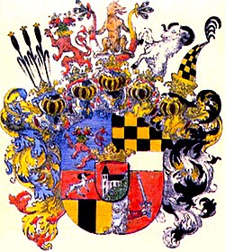 | Wappen des österreichischen Adelsgeschlechts von Walterskirchen Wappen ab 1643 nach Aufnahme aller Teile des Wappens der Ramming: Blasonierung aus dem Grafenstandsdiplom vom 9. April 1907: "Ein gevierteter Schild mit einem Herzschilde. Das erste blaue Feld des Hauptschildes zeigt ein nach rechts gewendetes zweiköpfiges, doppeltgeschwänztes Ungeheuer mit roten Pantherleibe, zwei grünen, von einer goldenen Laubkrone umfangenen Hälsen und roten, golden gekrönten Adlerköpfen. Das zweite Schildesfeld ist quer geteilt, oben von Schwarz und Gold geschacht, unten silbern. Das dritte gleichfalls quergeteilte Feld zeigt in seiner oberen roten Hälfte einen nach einwärts springenden silberfarbenen, schwarz bewehrten Widder, in der unteren goldenen Hälfte einen schwarzen Pfahl. Im vierten roten Felde ragt aus einer der Spaltungslinie angeschobenen natürlichen Wolke ein rot bekleideter Arm hervor, welcher in bloßer Faust ein blankes Schwert mit blauem Griff und ebensolcher Parierstange schwingt. Der mit einer goldenen Laubkrone geschmückte rote Herzschild zeigt einen aus dem Fußrande schräg nach links aufsteigenen natürlichen Laubwald, aus welchem sich Turm und Schiff einer aus silberfarbenen Quadern erbauten schwarz gedeckten Kirche erheben. Der Turm ist von drei schwarzen, zwei über einem gestellten, Fenstern und einer ebensolchen Türe, das Schiff von zwei nebeneinander gestellten schwarzen Fenstern durchbrochen. Das spitze Turmdach trägt einen vergoldeten Knauf. Auf dem oberen Rande des Hauptschildes ruhen fünf offene gekrönte Turnierhelme, der mittlere und die beiden Helme zur Rechten stahlfarben. die beiden Helme zur Linken vergoldet. Als Helmzier des mittleren, beiderseits von roten, rechts mit Silber, links mit Gold unterlegeten Decken umwallten Helmes dienen zwei, in den Mundlöchern mit je drei Pfauenfedern besteckte Büffelhörner, das Horn zur Rechten von Rot über Silber, das zur Linken von Gold über Rot quer geteilt. Zwischen den Büffelhörnern sitzt, den Kopf mit ausgeschlagener Zunge nach links wendend, ein natürlicher die Hörner mit seinen Vorderläufen umfassender Wolf. Aus der Krone des auf dem rechten Obereck des Schildes ruhenden, beiderseits von blauen und roten, mit Gold unterlegten Decken umwallten Helmes wachsen drei schwarze, golden gekrönte Mooskolben empor. Als Zimier des ihm zunächst angereihten, beiderseits von rot-silbernen Decken umgebenen Helmes dient das Ungeheuer des ersten Schildesfeldes, gleichfalls nach rechts gewendet. Der sich dem mittleren zur Linken anreihende, beiderseits von rot-silbernen Decken umwallte Helm trägt als Kleinod einen wachsenden silbernen schwarzbewehrten Widder. Der fünfte, auf dem linken Obereck des Schildes ruhende Helm ist beiderseits mit schwarzen, golden und silbern unterlegten Decken umgeben. Seine Krone trägt einen oben mit schwarzen Hahnenfedern besteckten Hut mit schwarz-gold geschachter spitzer Kappe und goldfarbener aufgeschlagener Krempe." | http://www.walterskirchen.at/ | Painting: unknown Photograph: Konrad Walterskirchen, for the website http://www.walterskirchen.at/ | Datei:Walterskirchen Wappen 5.jpg |