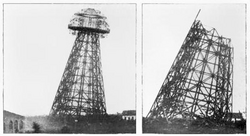 | Tesla's Wardenclyffe tower on Long Island in partial stage of demolition. On July 4, 1917 the Smiley Steel Company of New York began demolition of the tower by dynamiting it but it took till September to totally demolish it. Tesla built it in 1901-1903 and sold it to investors as a wireless communication center. He also wanted to demonstrate wireless transmission of electrical energy. Tesla ran out of funding before he could finish it. | The Literary Digest, Volume 55, September 8, 1917, page 25 | attributed to the "American Press Association" | Datei:Wardenclyffe tower tesla new york demolition july september 1917.png |