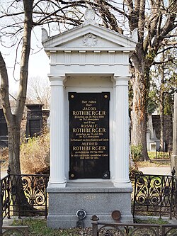 | Grab von Jacob Rothberger, Gründer des ehemaligen Wiener Warenhauses Rothberger, und seiner Familie im alten israelitischen Teil des Wiener Zentralfriedhofes (Tor 1, Gruppe 20, Reihe 19, Nr. 17) | Eigenes Werk | Papergirl | Datei:Rothberger grave, Vienna, 2017.jpg | |