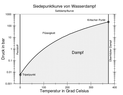 wenn man den Druck p in bar (absolut) einsetzt. Die zugehörige Temperatur θ ergibt sich in Grad Celsius. Diese Formel ist im Bereich p kr. > p > p = 3 bar (200 °C > θ > 100 °C) auf etwa 3 % genau.