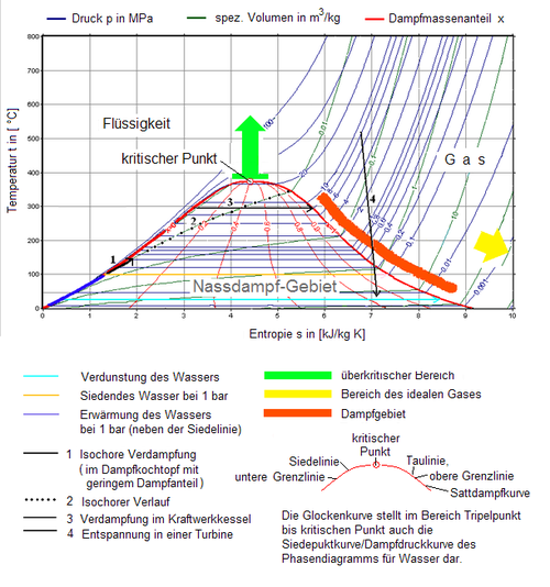 Wie aus dem Phasendiagramm entnommen wird, siedet Wasser bei einem Luftdruck von 0,4 bar schon bei etwa 75 °C (so etwa auf dem Mount Everest). Die aufzuwendende Verdampfungsenthalpie ist entsprechend größer, ebenso die Volumenzunahme des Dampfes. Mit steigendem Druck nimmt die Verdampfungsenthalpie des Wassers ab, bis sie im kritischen Punkt gleich Null ist. Daraus folgend die kleiner werdenden Flächen im T-s-Diagramm.