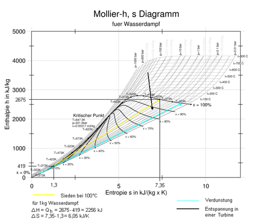 Bei einem Mollier-Diagramm wird die Entropie des Dampfes auf der Abszisse und die zugehörige Enthalpie auf der Ordinate aufgetragen. Die grundlegenden physikalischen Eigenschaften des Wasserdampfes lassen sich zwar nicht einfach interpretieren, jedoch können die zur Zustandsänderung des Dampfes nötigen Wärmemengen, also beispielsweise die Verdampfungsenthalpie, direkt von der Ordinate abgelesen werden.