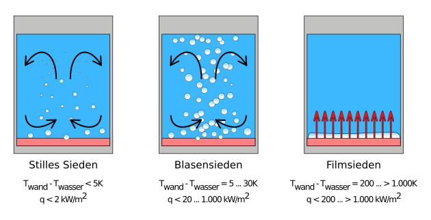 In Abhängigkeit von der Wärmestromdichte, die der siedenden Flüssigkeit über eine Heizfläche zugeführt wird, bilden sich unterschiedliche Formen des Siedens.