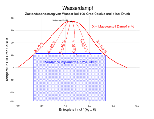 Die beiden Beiträge addiert ergeben also die Verdampfungsenthalpie H, die sich in einem Enthalpie-Entropie-Diagramm (h-s-Diagramm) in Form einer Differenz auf der y-Achse als spezifische Größe ablesen lässt. Das hier abgebildete T-s-Diagramm stellt die für die Verdampfung (bei 100 °C) notwendige Wärme in Form der gepunkteten blauen Fläche dar.