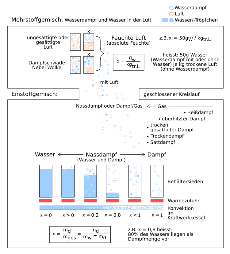 Der Inhalt des Nassdampfes an reinem Dampf ist durch den Massenanteil x gekennzeichnet, der sich mit folgender Formel berechnen lässt