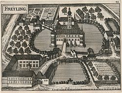 Westlich der Ortschaft Oftering liegt Freiling, heute Ortsteil der Gemeinde Oftering, 12 km nordöstlich von Wels. Der Ortsteil hat seinen Namen vom Schloss Frejling (heute Schloss Freiling) erhalten. Das Gebäude liegt mitten im Ortszentrum, ist jedoch durch den hohen und dichten Baumbestand rund um das Schloss nicht einsehbar. Ausschlaggebend für den Bau der einstigen Burganlage war die günstige Lage zwischen Wels und Linz.