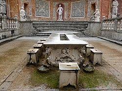 Fürstentisch des Fürsterzbischofs Markus Sitticus von Hohenems, errichtet 1613, Standort im Theatrum der Wasserspiele des Schlosses Hellbrunn, Salzburg | Wikipedia, Wasserspiele Hellbrunn | Henning Schröder | Datei:Hellbrunn 2.jpg | |