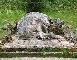 Die Wildschweinnische zeigt ein kunstvoll gestaltetes und offensichtlich glückliches Mutterschwein (Bache) samt ihren zwei Frischlingen.