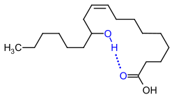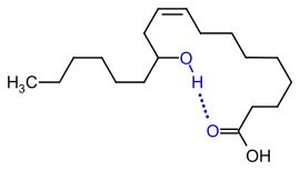 | Intramolekulare Wasserstoffbrückenbindung bei Recinolsäure | Eigenes Werk | Roland.chem | Datei:Ricinolsäure cyclisch.svg |
