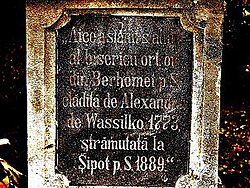 | Gedenksstein für die Kirche in Berhometh, die Alexander Wassilko 1773 errichten ließ, die sein Namensvetter der Freiherren1889 wegen eines Neubaus abtrug und in Szypot wieder aufbaute. | Eigenes Werk | Sacha47 | Datei:Gedenksstein für die Kirche in Berhometh.jpg | |