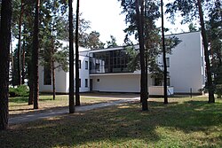 Bis zur Schließung des Bauhauses im Jahr 1933 nach der nationalsozialistischen Machtübernahme, war Kandinsky als Lehrer in Weimar, Dessau und Berlin tätig, wo er in Kontakt mit dem russischen Konstruktivismus kam. In dieser Zeit setzten sich endgültig die geometrischen Strukturen in seinen Bildern durch. Nach dem Weggang von Johannes Itten aus Weimar 1923 bis zur endgültigen Schließung des Bauhauses zehn Jahre darauf, war er dessen stellvertretender Direktor.[44] Kandinsky wohnte in Weimar zunächst in der Wohnung von Gropius, dann in einer Pension in der Cranachstraße 7a und schließlich, ab Herbst 1923, in einer kleinen möblierten Wohnung in der Südstraße 3 (heute: Wilhelm-Külz-Straße).[45] In Dessau war er gemeinsam mit Paul Klee einer der Bewohner der Meisterhäuser des Bauhauses.