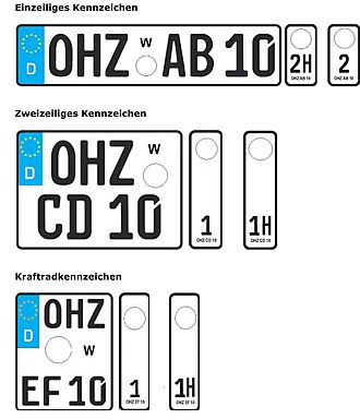 Durch eine Änderung der Fahrzeugzulassungsverordnung können in Deutschland seit dem 1. Juli 2012 Wechselkennzeichen ausgegeben werden. Dabei besteht das Wechselkennzeichen aus einem gemeinsamen Teil (Wechselelement), der gegebenenfalls vor der Fahrt umgesteckt werden muss, und je einem starren, fahrzeugbezogenen Teil für jedes Fahrzeug[1] nach dem Muster „OHZ AB 10“ (Wechselelement) + „2“ (starrer Teil). Das bei der Zulassungsstelle eingetragene Kennzeichen des Fahrzeuges lautet somit „OHZ AB 102“. Das hiermit gepaarte Fahrzeug könnte als Kennzeichen beispielsweise „OHZ AB 105“ erhalten, bei dem als starrer Teil „5“ angebracht wird.