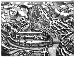 | Kupferstich der Stadt Steyr | Scan aus: Georg Matthäus Vischer – Topographia Austriae superioris modernae , Tafel 177 (1674) Wien: Archiv Verlag 2005 (Reprint) | Matthäus Merian | Datei:STATT STEYER (Merian).png | |
