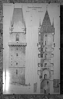 An der Nordostecke hat der Turm ab Gehsteigkante eine Gesamthöhe von 59,52 Meter, wobei das steile Keildach selbst eine Höhe von 17,48 Meter hat. Der Turm hat einen rechteckigen Grundriss. Die Seitenlängen betragen beim Untergeschoß 12,9 und 12,2 Meter und die vom Erdgeschoß bis zum dritten Obergeschoß 12,6 und 11,9 Meter. Das vierte Obergeschoß hat Seitenlängen von 12,3 und 11,6 Meter. Die Mauerstärke nimmt nach oben hin ab. Beim Untergeschoß bzw. Sockelgeschoß beträgt sie 2,35 Meter, beim Erdgeschoß 2,2 Meter, beim ersten Obergeschoß 2,15 Meter, beim zweiten und dritten Obergeschoß 1,9 Meter und beim vierten Obergeschoß 1,3 Meter. Die umlaufende Galerie wird von 36 Kragsteinen getragen, die in Abständen von 1,4 Meter angeordnet sind. Der Gang hat eine Breite von 0,85 Meter und eine Brustwehrhöhe von 1,27 Meter.[2]