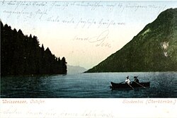 | Postkarte Weissensee, Berge, Boot, See, Ostufer, Ufer, Wald, Sommer, Stockenboi, Oberkärnten | Postkarte | unbekannt | Datei:Jahrhundertwende Weissensee.jpg |