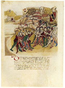| Die Schweiz im MIttelalter in Diebold Schillings Spiezer Chronik, Studienausgabe, Faksimile der Handschrift Mss. hist. helv. I. 16 der Burgerbibilothek Bern, hrsg. von Hans Haeberli und Christoph von Steiger, Luzern: Faksimile Verlag, 1991. | prometheus.uni-koeln | Diebold Schilling der Ältere | Datei:Schilling Spiezer Chronik 08.jpg | |