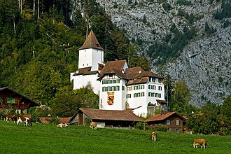 | Wimmis, im Schloss war bis vor kurzem das Amtsgericht untergebracht. | Eigenes Werk | WillYs Fotowerkstatt | Datei:Wimmis Schloss Kirche-3.jpg |