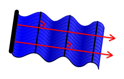| Wellenfront (in schwarz) einer sich geradlinig (in rot) ausbreitenden Welle. | Eigenes Werk | Expes | Datei:Wellenfront-1.svg | |