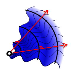 | Kreisförmige Wellenfront (in schwarz) einer sich radial (in rot) ausbreitenden Welle. | Eigenes Werk | Expes | Datei:Wellenfront-2.svg |