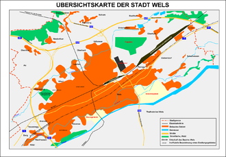 Unabhängig davon ist Wels auch in sechs Katastralgemeinden gegliedert: Lichtenegg, Obereisenfeld, Pernau, Puchberg, Untereisenfeld und Wels selber.[2] Die Katastralgemeinden Lichtenegg, Pernau und Puchberg sind in ihren Umfang größer als die heute landläufig so bezeichneten Ortschaften und entsprechen in ihren Grenzen den 1939 eingemeindeten Nachbargemeinden von Wels.