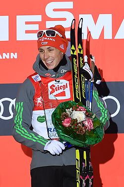 | FIS Weltcup Nordische Kombination vom 16.-18. Dezember 2016 in Ramsau am Dachstein. Siegerehrung am 18. Dezember 2016. Bild zeigt Eric Frenzel (GER). | Eigenes Werk | Ailura | Datei:20161218 FIS WC NK Ramsau 1388.jpg | |