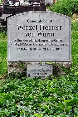 | Grab von Wenzel von Wurm (1859–1921), Generaloberst der österreichisch-ungarischen Armee und Kommandant der Isonzo-Armee, am Wiener Zentralfriedhof (Tor 2, Gruppe 48B, Reihe 3, Nr. 16). | Eigenes Werk | Papergirl | Datei:Grave of Wenzel von Wurm, Vienna, 2020.jpg | |