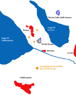 - Die zweite Halbbatterie (aus dem Batterieblock) bestrich den nördlichen Bereich des Caldonazzosees mit den Ortschaften Caldonazzo und Calceranica al Lago und die dahinterliegende, bergaufwärts führende Straße nach Mattarello [4] und Trient.
