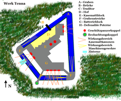 | Plan des österreichisch-ungarischen Festungswerks Tenna im Trentino. | Eigenes Werk | Stoabeissa | Datei:Tenna Kopie.png |