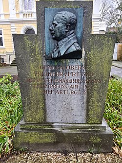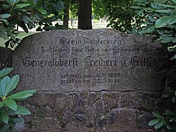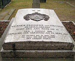 | grave of Werner von Fritsch on Invalidenfriedhof cemetery in Berlin (1939)English translation:Werner Baron Von FritschColonel GeneralChief of 12th Artillery RegimentBorn 4 August 1880Killed at Warsaw on 22 September 1939 Be faithful, even to the point of death, and I will give you the crown of life. (Revelation 2:10) | Eigenes Werk | Beek100 | Datei:Invalidenfriedhof, Grabmal von Fritsch.jpg | |