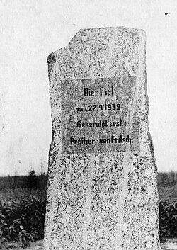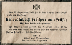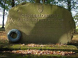 - ↑ Der Gedenkstein in Hoppenstedt hat die Inschrift: „Generaloberst Freiherr von Fritsch, geboren am 4.8.1880, gefallen am 22.9.1939, Oberbefehlshaber des Heeres vom 1.2.1934 bis 4.2.1938. Dem deutschen Offizierskorps vorgelebt vom 27.1.1900 bis 22.9.1939. Dem deutschen Heer vorgestorben durch seinen Heldentod vor Warschau.“