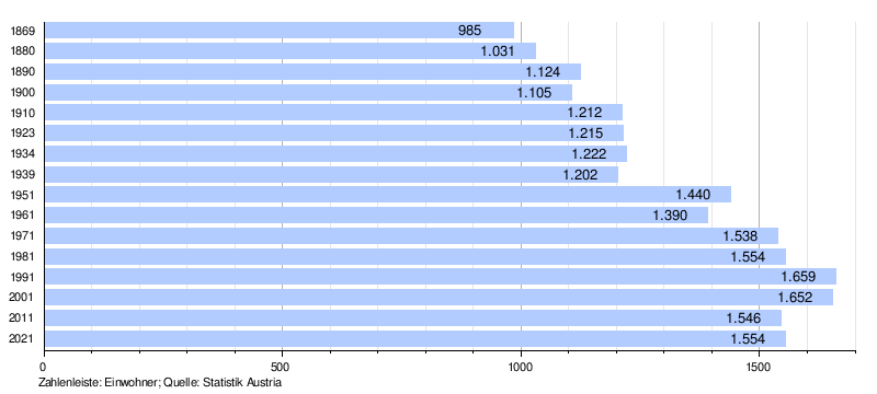 1991 hatte die Gemeinde einen Höchststand von 1.659 Einwohnern. Danach ging die Bevölkerungszahl wegen einer negativen Wanderungsbilanz auf 1.652 Personen im Jahr 2001 zurück. Da im nächsten Jahrzehnt auch die Geburtenbilanz negativ wurde, sank die Einwohnerzahl auf 1.546 im Jahr 2011 und 1.554 im Jahr 2021.[5]