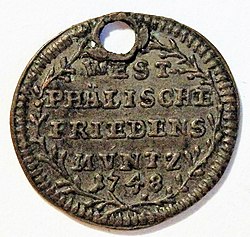 Von vielen Zeitgenossen wurde der Friede als heiß ersehntes Ende eines jahrzehntelangen Krieges begrüßt. Bis zum Ende des 18. Jahrhunderts galt er insbesondere den Protestanten als Fundament der reichsständischen Libertät und Quelle der Religionsfreiheit der Reichsstände. Andererseits sah der Papst den Religionsfrieden kritisch und die nachfolgenden Kriege Ludwigs XIV., insbesondere der Holländische Krieg, wurden durch den Westfälischen Frieden auch nicht verhindert.[14] Im Jahr 1748 wurde in den deutschen Staaten eine Vielzahl von Medaillen auf den Westfälischen Frieden geprägt, die zeigen, welche große Bedeutung diesem Frieden auch 100 Jahre danach noch immer beigemessen wurde.