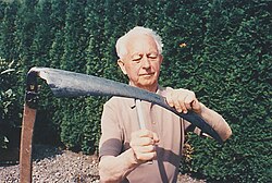 | Wetzsteinerzeugung im Schwarzachtobel (in Schwarzach, Vorarlberg , Österreich . Edwin Troll beim schleifen einer Sense. | Eigenes Werk | HANS Hefel | Datei:Edwin Troll.jpg | |