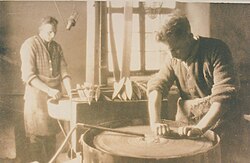 | Wetzsteinerzeugung im Schwarzachtobel (in Schwarzach, Vorarlberg , Österreich . Wetzsteinschleifer bei der Arbeit in der Troll-Schleife. | Eigenes Werk | HANS Hefel | Datei:Fa. Troll - Handschleifer.jpg | |