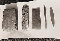 | Wetzsteinerzeugung im Schwarzachtobel (in Schwarzach, Vorarlberg , Österreich . Vom Rohmaterial zum fertigen Wetzstein. | Eigenes Werk | HANS Hefel | Datei:Vom Brocken zum Wetzstein.jpg |