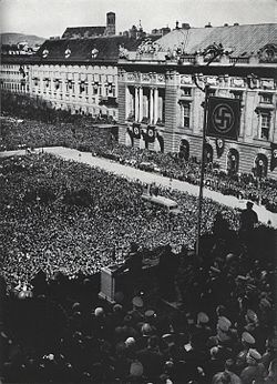 | Es folgt die historische Originalbeschreibung , die das Bundesarchiv aus dokumentarischen Gründen übernommen hat. Diese kann allerdings fehlerhaft, tendenziös, überholt oder politisch extrem sein. Diese Beschreibung ist tendenziös oder falsch: Nazi terminology (in Scherl version, not ADN version) Scherl Bildedienst: Sehnsucht von Geschlechtern fand ihre Erfüllung: Österreich kam wieder heim zum Reich. Am Dienstag, dem 15. März 1938, sprach Adolf Hitler zum ersten Male von der Rampe der Wiener Hofburg zu seinem Volk und zur Welt. Dankbar konnte er die Erfüllung dieser grossen, ihm vom Schicksal auferlegten Aufgabe als vollzogen vor der Geschichte melden. ADN-ZB/Archiv Einmarsch der faschistischen deutschen Wehrmacht in Österreich und Annexion des Landes im März 1938. Ansprache Adolf Hitlers am 15. März 1938 auf dem Helden-Platz in Wien. 35143-38 | Dieses Bild wurde im Rahmen einer Kooperation zwischen dem deutschen Bundesarchiv und Wikimedia Deutschland aus dem deutschen Bundesarchiv für Wikimedia Commons zur Verfügung gestellt. Das deutsche Bundesarchiv gewährleistet eine authentische Bildüberlieferung nur durch die Originale (Negative und/oder Positive), bzw. die Digitalisate der Originale im Rahmen des Digitalen Bildarchivs . | Unbekannt Unknown | Datei:Bundesarchiv Bild 183-1987-0922-500, Wien, Heldenplatz, Rede Adolf Hitler.jpg | |