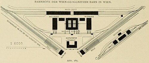 | Aufsicht der Bahnhöfe der Wien-Gloggnitzer Bahn in Wien | Geschichte der Eisenbahnen der Österreich-Ungarischen Monarche, Karl Prochaska, 1898, Band 2, S. 330 | Autor/-in unbekannt Unknown author | Datei:Bahnhöfe der Wien-Gloggnitzer Bahn in Wien 02.jpg | |