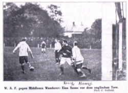 | 1912 football match with defender clearing the ball from the goalmouth | https://www.middlesexwanderersafc.co.uk/archive/ | Carl Seebald | Datei:WAF Wien vs Middlesex Wanderers, 1912.png | |