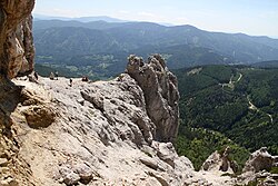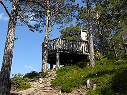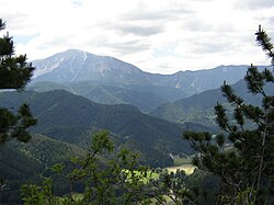 | Die Hohe Wand Richtung Westen im Bereich zwischen dem Hubertushaus und der Großen Kanzel. Im Vordergrund links der Weningerturm, über den der 2013 eröffnete Gebirgsvereinssteig führt (einer der längster Klettersteige der Hohen Wand und erster im östlichen Niederösterreichs mit einer Seilbrücke). Etwas links der Bildmitte der Baumgartnerturm, rechts davon der Wildenauerturm, der durch den klassischen Wildenauersteig (1919 eröffnet) erschlossen ist und ganz rechts die Hochfallwand. Im Hintergrund Grünbach am Schneeberg und wiederum dahinter der noch leicht schneebedeckte Schneeberg, Niederösterreichs höchster Berg. | Eigenes Werk | C.Stadler/Bwag | Datei:Hohe Wand.JPG | |