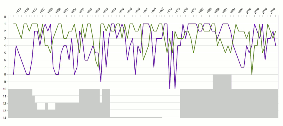| Graph charting finishing league positions of Austrian football club rivals Rapid Wien and Austria Wien | Eigenes Werk | Xenomorph1984 | Datei:Wien graph 2011.gif | |