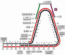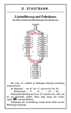 Zudem waren die Strecken ab der Elektrifizierung etwas kürzer. So begann die Obere Wientallinie in Hütteldorf-Hacking fortan nicht mehr beim Kilometer 0,000, sondern erst beim Kilometer 0,075, bezogen auf die Schleifenmitte.[34] Auf der Gürtellinie lag die neue Endstation Heiligenstadt, wiederum bezogen auf die Schleifenmitte, jetzt schon beim Kilometer 8,317[35] statt zuvor beim Kilometer 8,407. Die Donaukanallinie verkürzte sich sogar um 328 Meter, weil sie jetzt vor dem Bahnhof Heiligenstadt in die Gürtellinie einmündete.