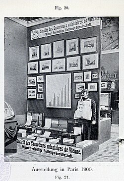 | Präsentation der Wiener Freiwilligen Rettungs-Gesellschaft in Paris, 1900 | Festschrift der Wiener Freiwilligen Rettungs-Gesellschaft, herausgegeben anläßlich ihres 25jährigen Bestandes, 9. Dezember 1906 | unknown, scan by GuentherZ | Datei:WFRG Fig20 Ausstellung Paris 1900.jpg | |