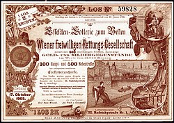 | Lotterielos der Wiener Freiwilligen Rettungsgesellschaft vom April 1905 | Sammlung eines Mitglieds des Ersten Deutschen Historic-Actien-Clubs e.V. (EDHAC e.V.); (kl) | Unbekannte Autoren und Grafiker; Scan vom EDHAC e.V. | Datei:Wiener freiwillige Rettungs-Gesellschaft 1905.jpg |